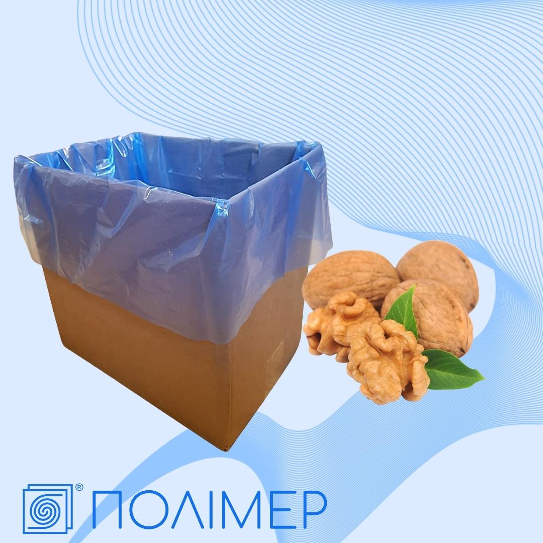 Маємо найкращий варіант для якнайдовшого зберігання та подальшого транспортування горіхів – мішки-вкладиші із поліетилену для картонних коробок та ящиків. Завдяки своїй будові, вони легко протидіють головним ворогам харчової сировини, таким як: волога, висока температура та ультрафіолет. Полиетиленовий мішок не намокає, захищає від сонячних променів та погодніх умов, які б могли негативно впливати на ядро горіха.
